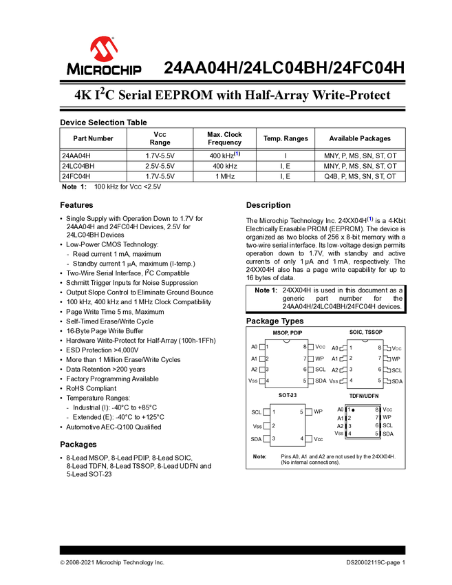 24AA04H 24AA04H/24LC04BH/24FC04H 4K I2C Serial EEPROM with Half-Array Write-Protect