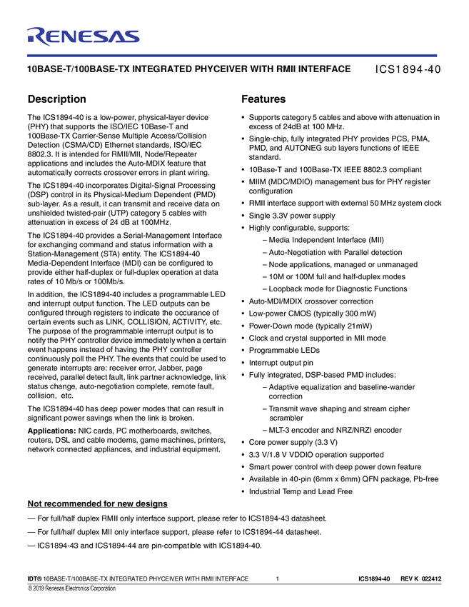 1894K-40LF 10Base-T/100Base-TX Integrated PHYceiver™ with RMII Interface