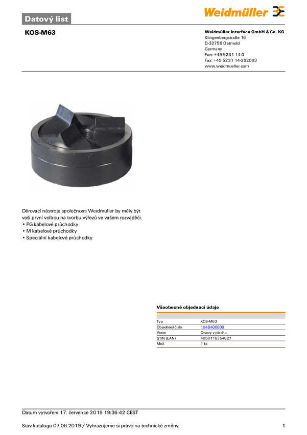 1548400000 Weidmüller 1548400000 Tłocznik 63.5 mm