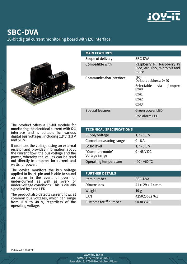 SBC-DVA Cyfrowy monitoring natężenia prądu Joy-it SBC-DVA 1 szt.