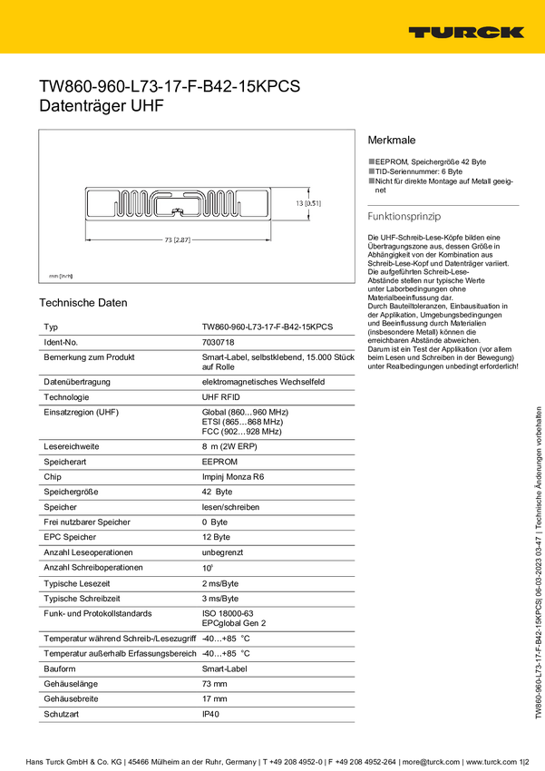 7030718 Turck TW860-960-L73-17-F-B42-15KPCS Transponder RFID