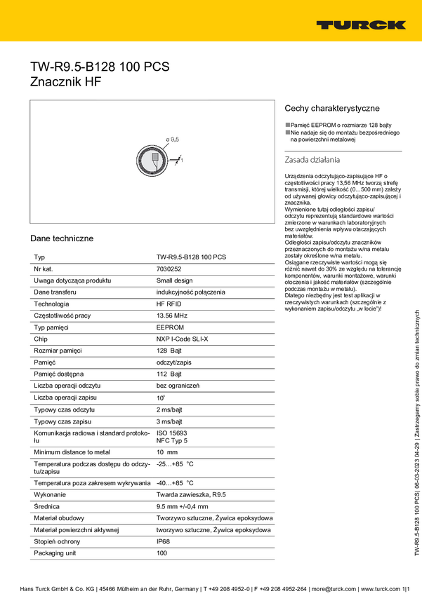 7030252 Transponder RFID Turck TW-R9.5-B128 100 pcs 7030252, 100 szt.