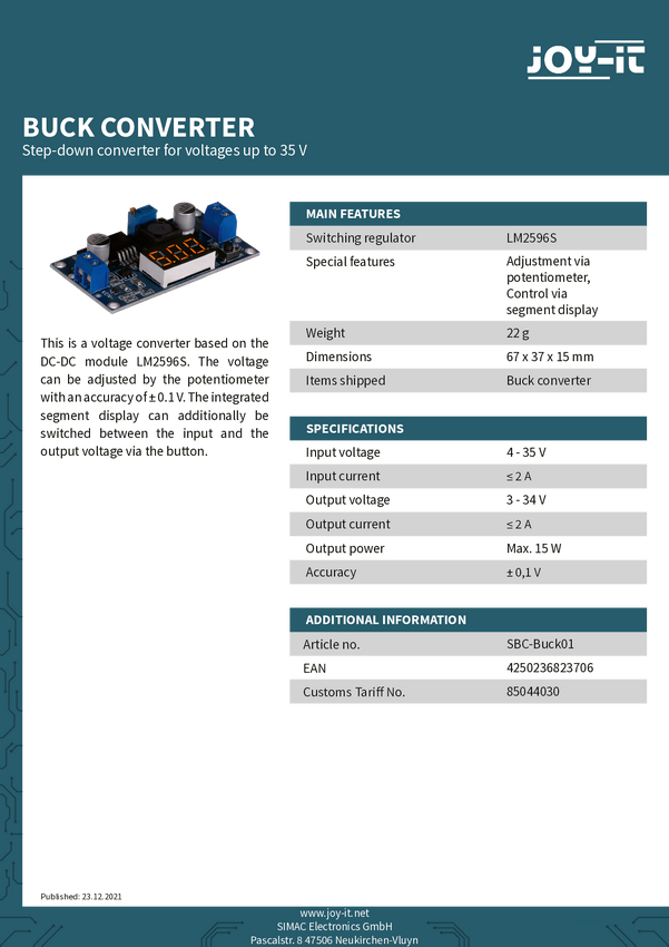Regulator napięcia Joy-it SBC-Buck01 Moduł Step Down DC/DC 1 szt.