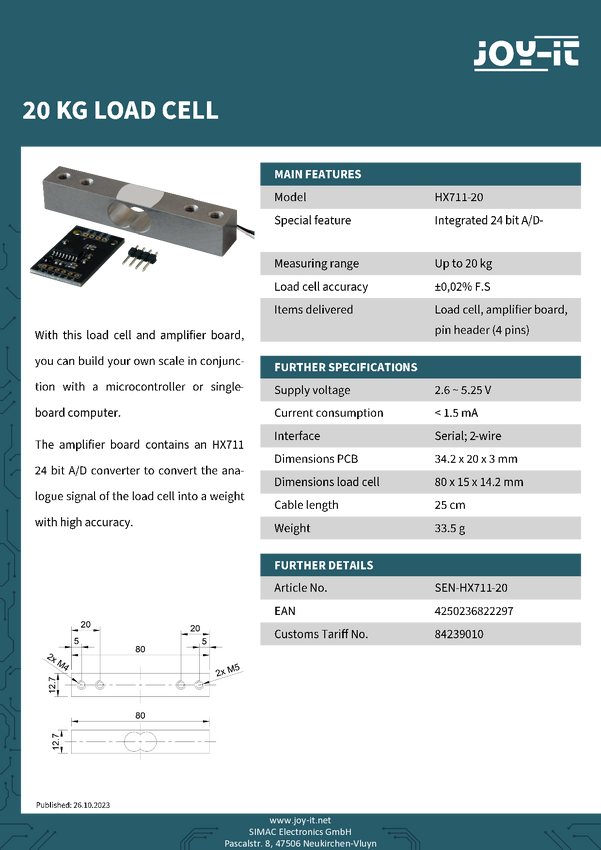 SEN-HX711-20 Ogniwo obciążeniowe Joy-it SEN-HX711-20 1 szt.