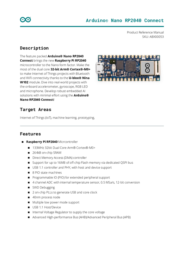 ABX00053 Arduino Płytka NANO RP2040 CONNECT I/O-Pins ABX00053 Nano