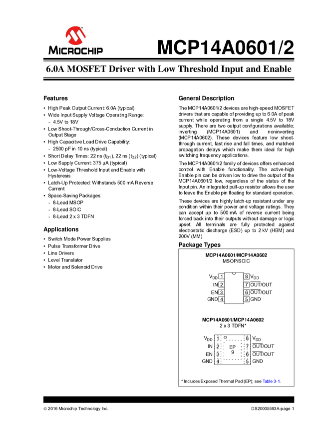 MCP14A0602 MCP14A0601/2 Single 6.0A Driver with Different Input and Enable Pin