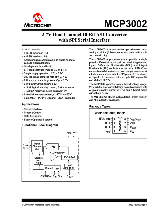 MCP3002 - 2.7V Dual Channel 10-Bit A/D Converter with SPI Serial Interface