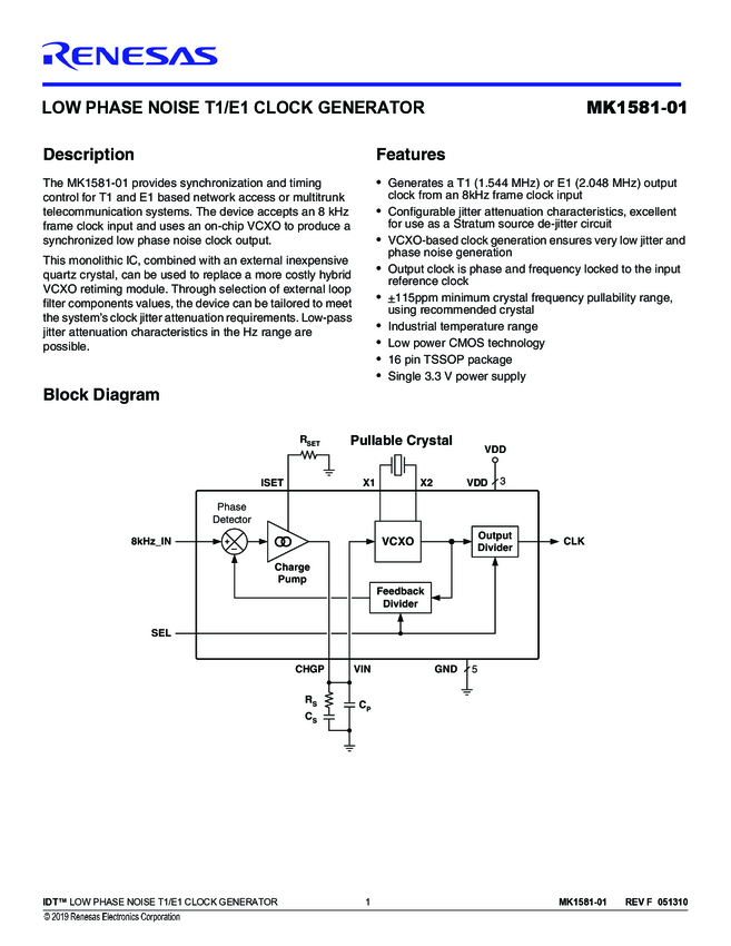 MK1581-01GILF Low Phase Noise T1/E1 Clock Generator