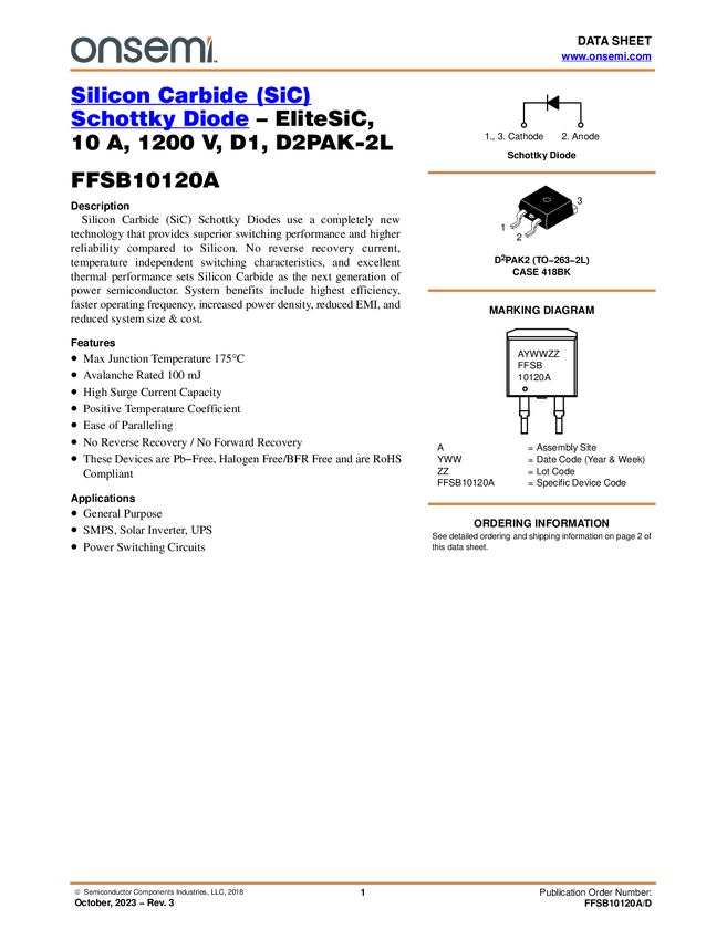 FFSB10120A Silicon Carbide (SiC) Schottky Diode – EliteSiC, 10 A, 1200 V, D1, D2PAK-2L