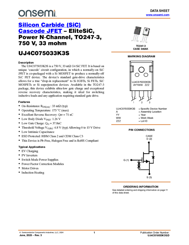 Silicon Carbide (SiC) Cascode JFET - EliteSiC, 33 mohm, 750V, TO-247-3L