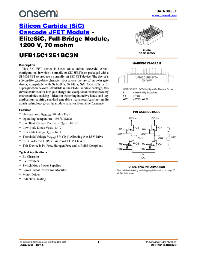 UFB15C12E1BC3N Silicon Carbide (SiC) Cascode JFET Module - EliteSiC, 70 mohm, 1200V