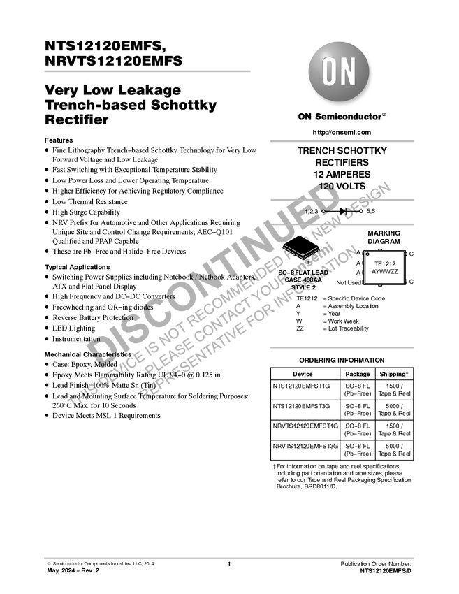 TS12120EMFS Trench Schottky Rectifier with Very Low Leakage, 12 A, 120 V