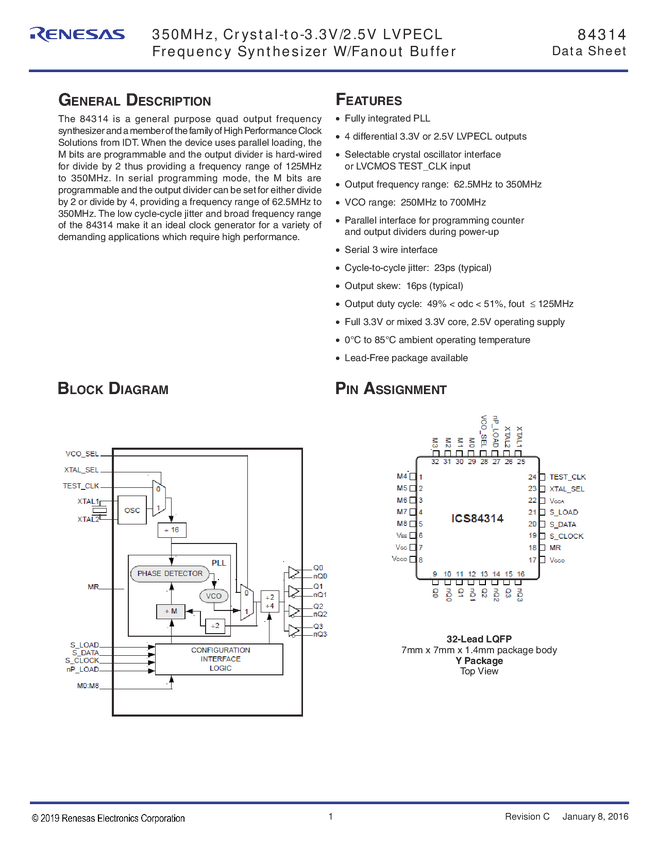 84314AYLF LVPECL Frequency Synthesizer w/ Fanout Buffer