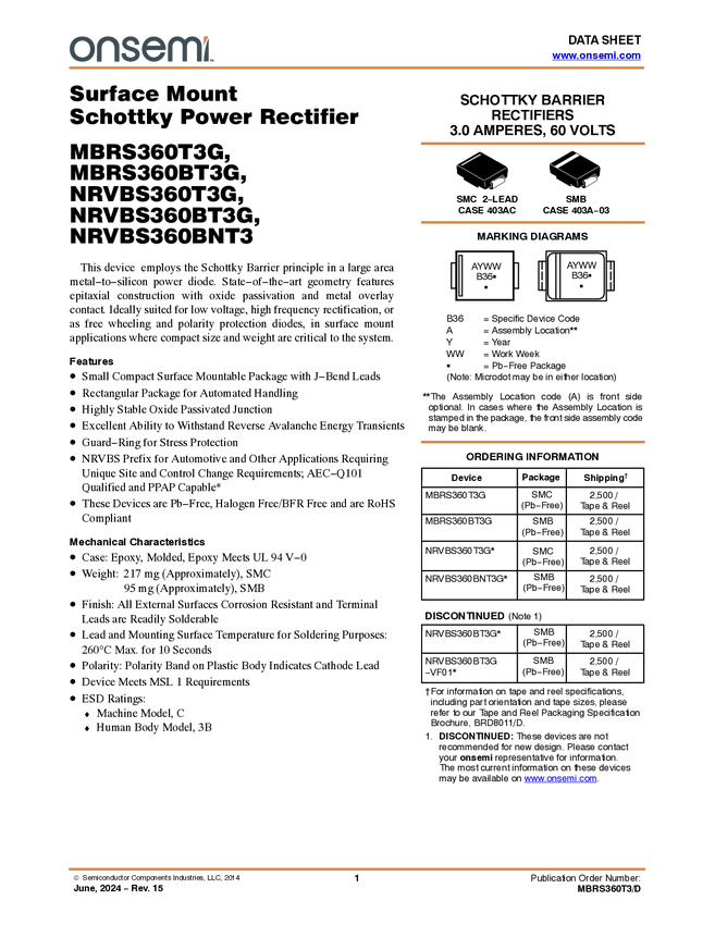 MBRS360 Schottky Power Rectifier, Surface Mount, 3.0 A, 60 V