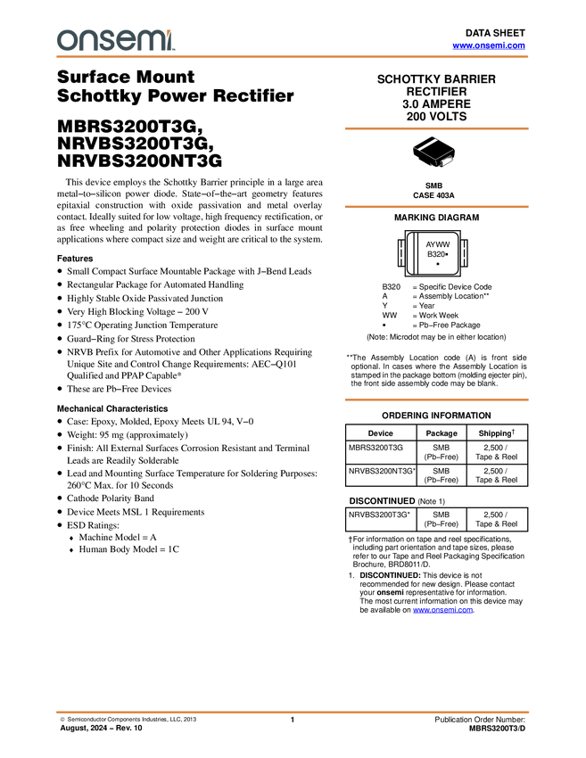 MBRS3200 Schottky Power Rectifier, Surface Mount, 3.0 A, 200 V