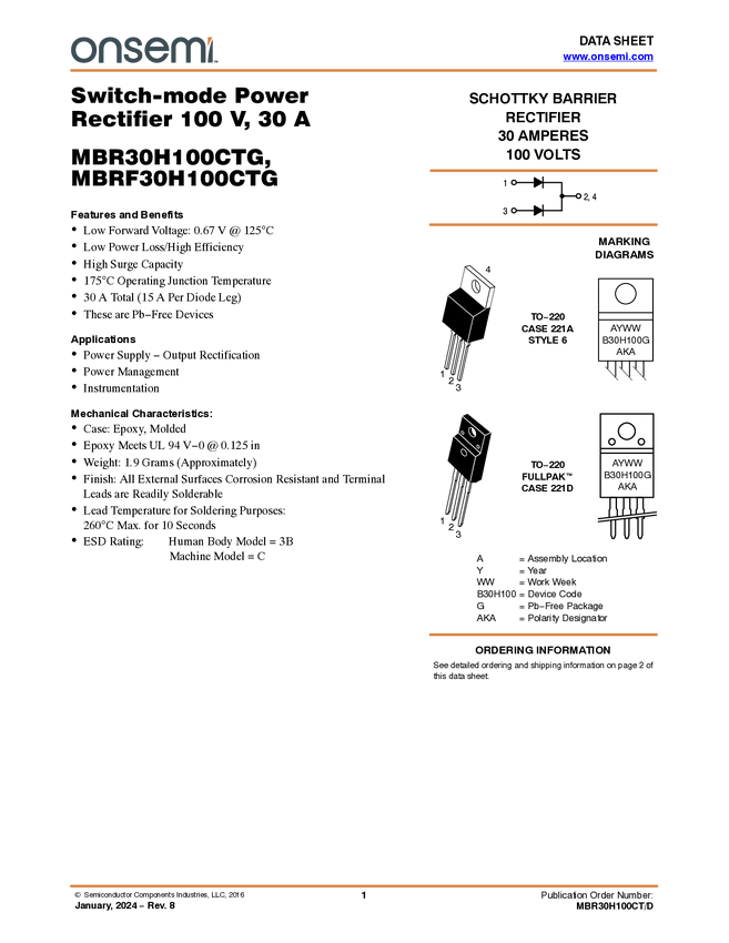 MBRF30H100CTG Schottky Barrier Rectifier, H-Series, 100 V, 30 A