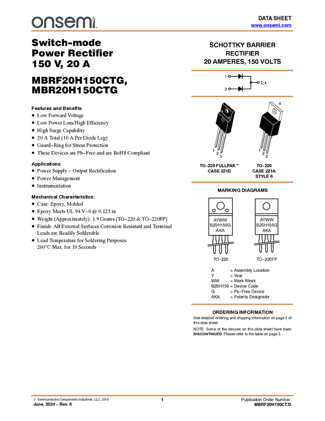 MBRF20H150CTG 150 V, 20 A H-Series Dual Schottky Rectifier