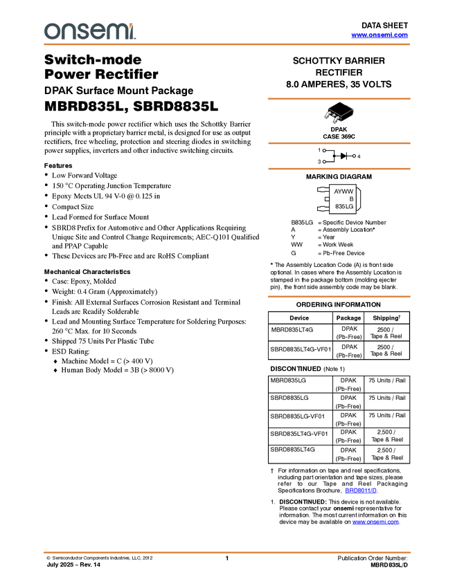 MBRD835L Schottky Barrier Rectifier, 35 V, 8.0 A