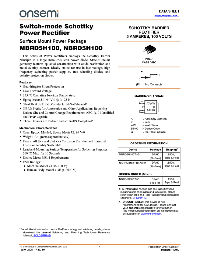 MBRD5H100T4G Schottky Power Rectifier, Switch-mode, 5.0 A, 100 V