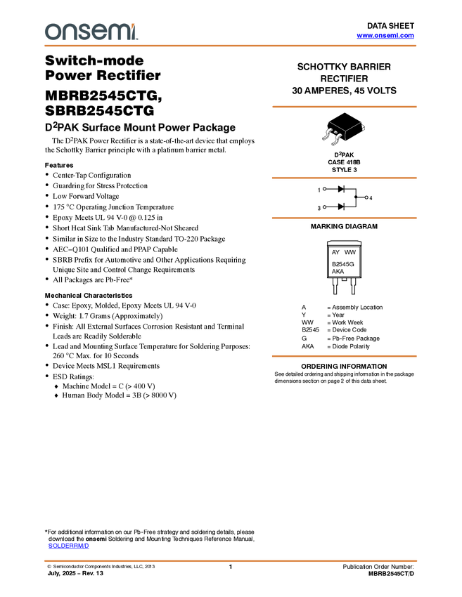 MBRB2545CT Schottky Power Rectifier, Switch-mode, 30 A, 45 V