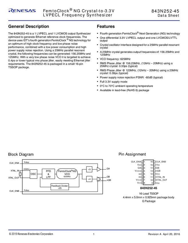 843N252GG-45LF FemtoClock NG Crystal-to-3.3V LVPECL Frequency Synthesizer