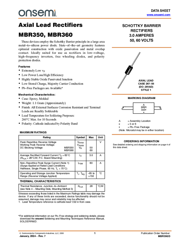 MBR360 Schottky Barrier Rectifier, 60 V, 3.0 A