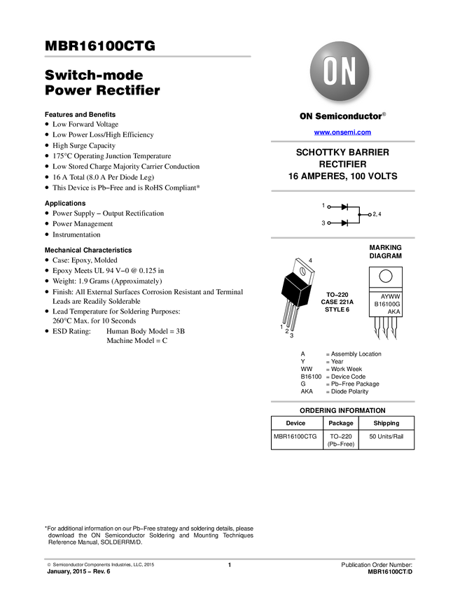 MBR16100CT Schottky Barrier Rectifier, 100 V, 16 A