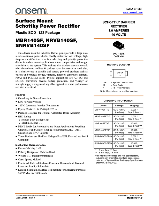 MBR140SF 1.0 A, 40 V, Schottky Power Rectifier, Surface Mount