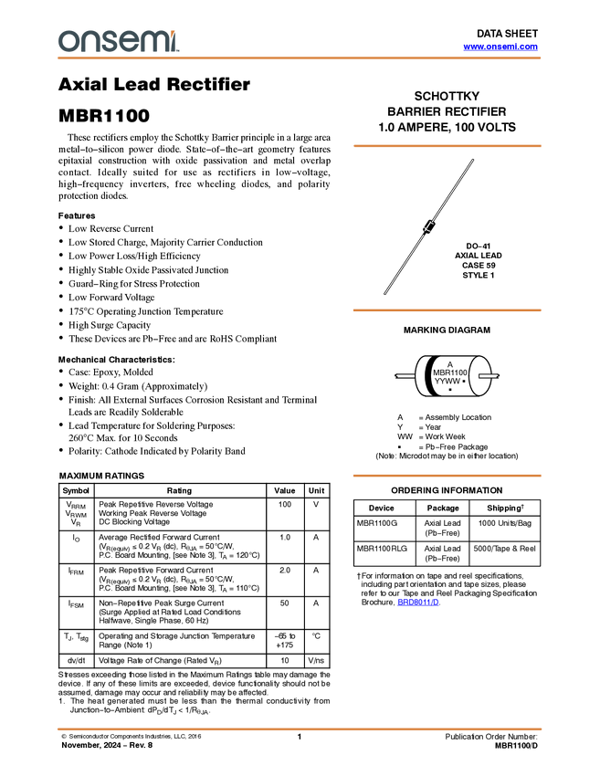 MBR1100 1.0 A, 100 V, Schottky Barrier Rectifier