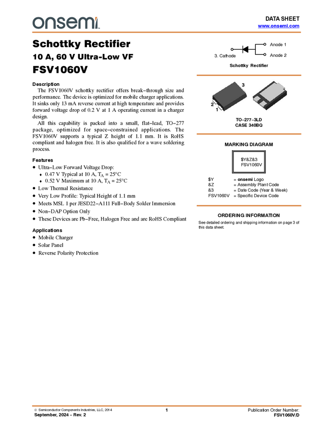 FSV1060V 10 A, 60 V Ultra-Low VF Schottky Rectifier