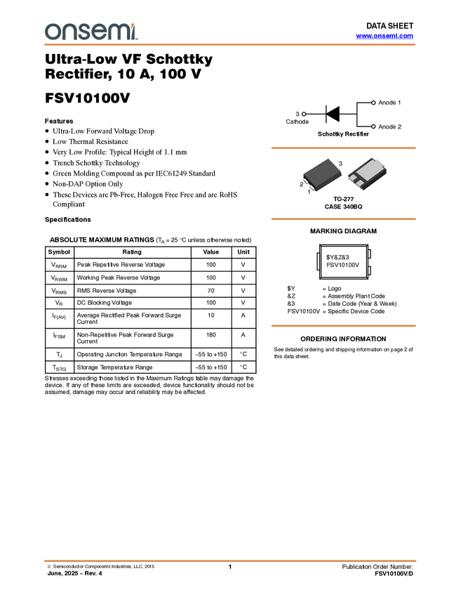 FSV10100V 10 A, 100 V Ultra-Low VF Schottky Rectifier