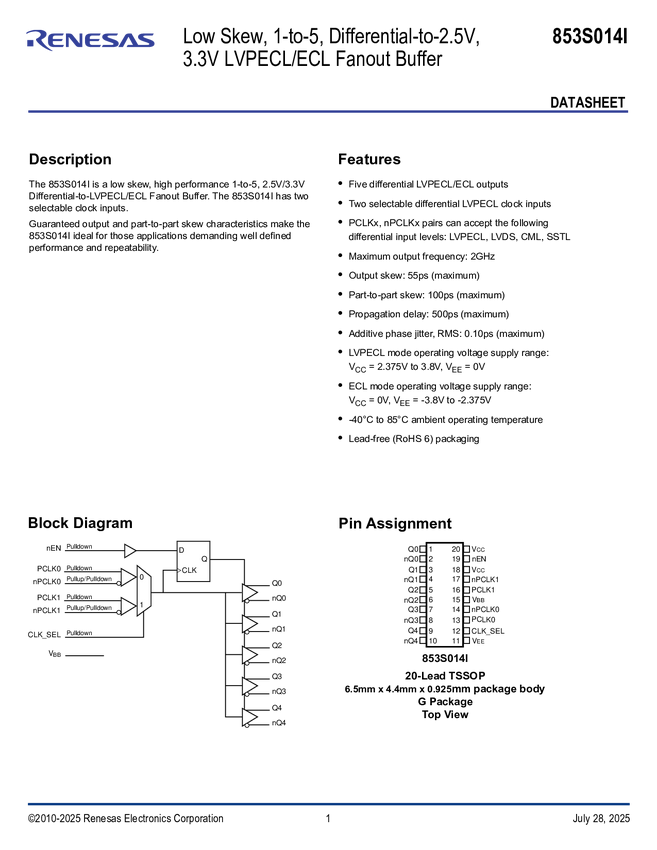 853S014AGILF Low Skew,1-to-5 Differential-to-2.5V,3.3V LVPECL/ECL Fanout Buffer