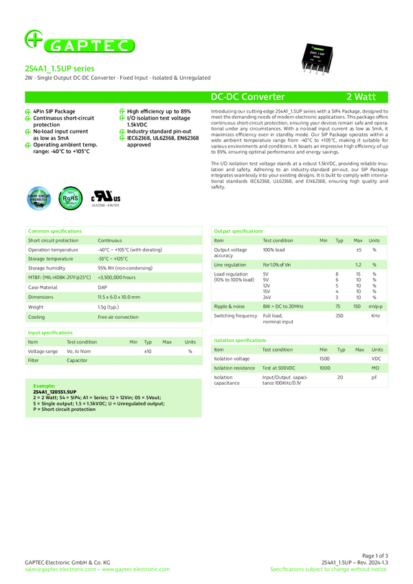 2S4A1_0515S1.5UP Gaptec 2S4A1_0515S1.5UP Przetwornica DC/DC 133 mA 2 W Content 1 szt.