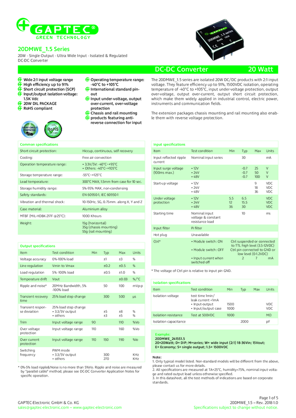 20DMWE_1203S1.5 Gaptec 20DMWE_1203S1.5 Przetwornica DC/DC 5 A 20 W Content 1 szt.