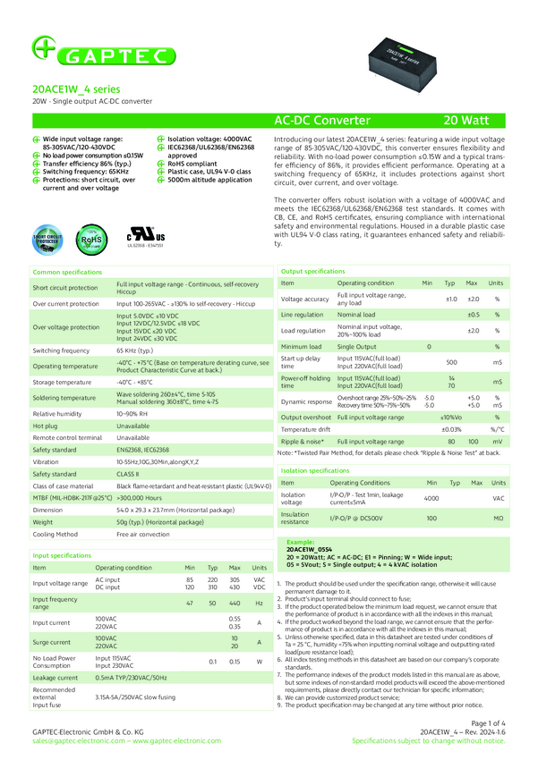 Konwerter AC/DC Gaptec 20ACE1W_4 5 V/DC 4000 mA 20 W