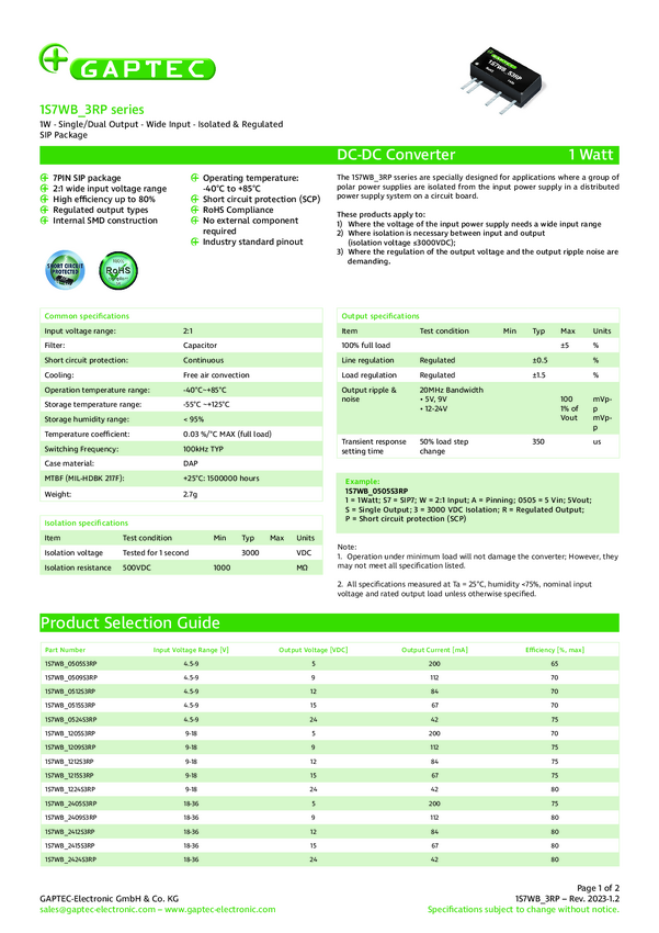 1S7WB_0505S3RP Gaptec 1S7WB_0505S3RP Przetwornica DC/DC 200 mA 1 W Content 1 szt.