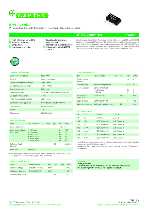 1S7AE_2412S1U Gaptec 1S7AE_2412S1U Przetwornica DC/DC 1S7AE_1U, SIP-7 (4 Pins), 1 W,...