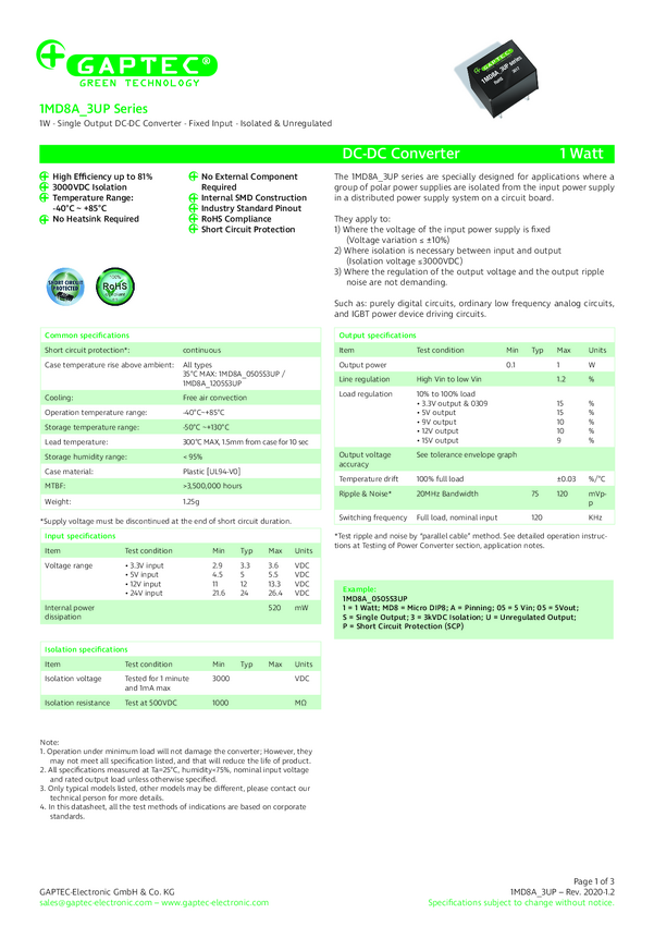 1MD8A_0303S3UP Gaptec 1MD8A_0303S3UP Przetwornica DC/DC 1MD8A_3UP, DIP-7 (4 Pins), 1 W...