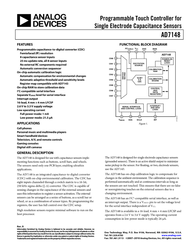 AD7148: CapTouch™ Programmable Controller for Single-Electrode Capacitance Sensors