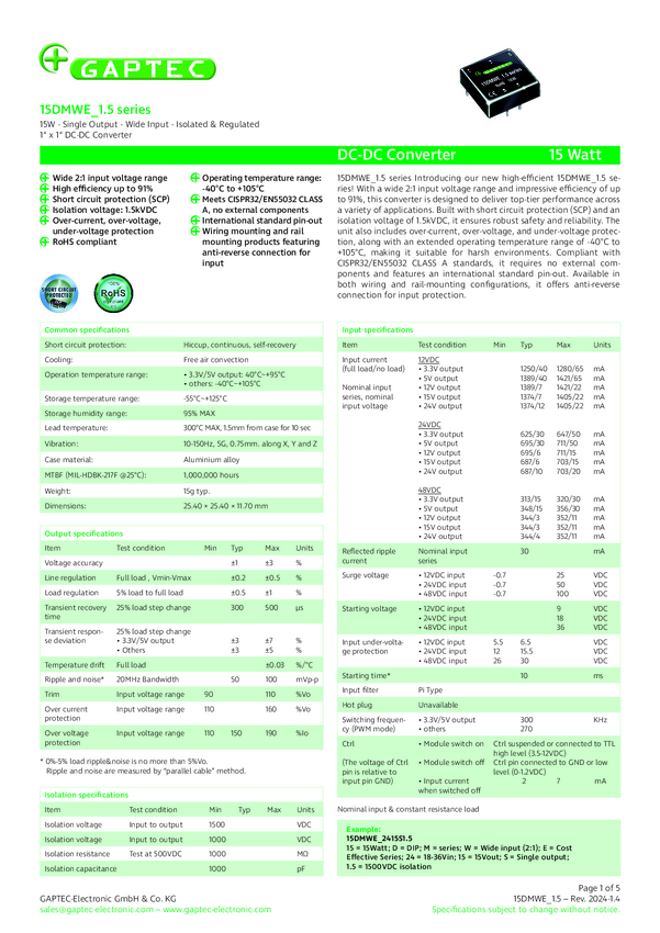 15DMWE_1203S1.5 Gaptec 15DMWE_1203S1.5 Przetwornica DC/DC 15DMWE_1.5, DIP-6, 15 W, 4 A,...