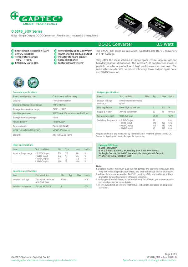 Gaptec 0.5S7B_0303S3UP Przetwornica DC/DC 0.5S7B_3UP, SIP-7 (4 Pins), 0.5 W, 152 mA, 1 szt.