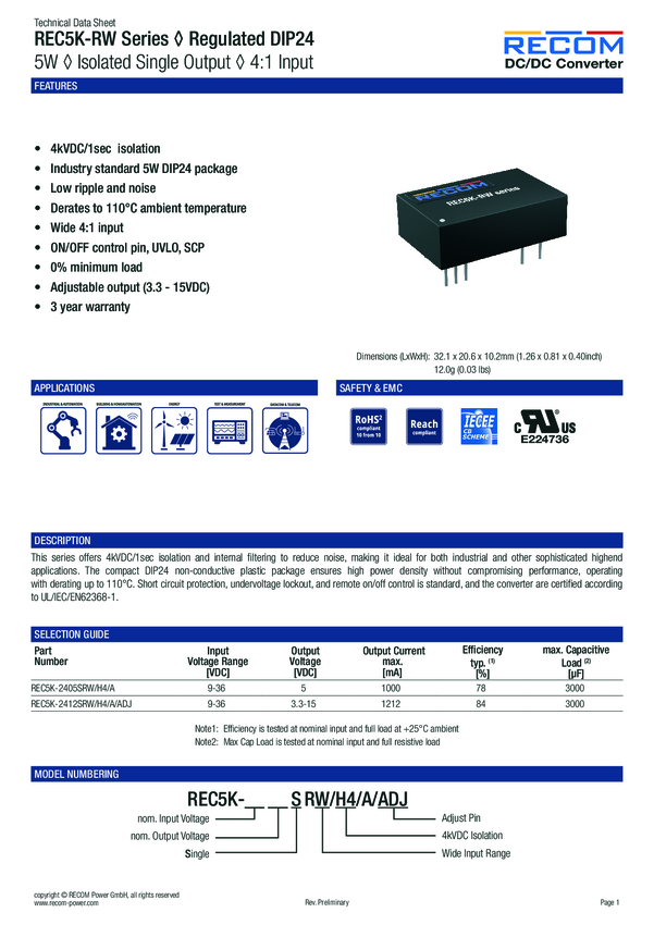 REC5K-2405SRW/H4/A RECOM REC5K-2405SRW/H4/A Przetwornica DC/DC, do PCB 1 A 5 W Ilo...