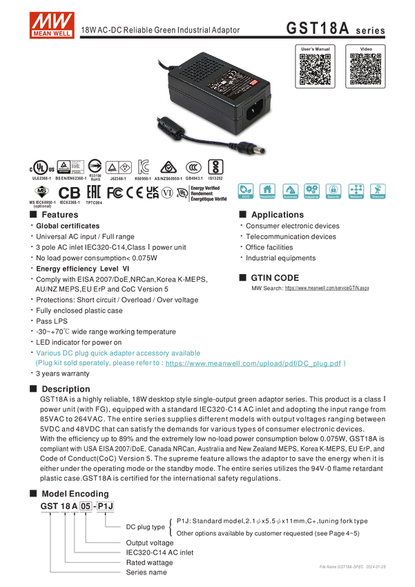 GST18A07-P1J Zasilacz stałonapięciowy MW Mean Well GST18A07-P1J 2 A 15 W