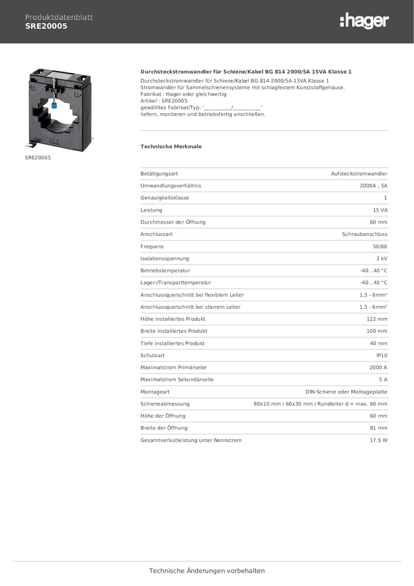 SRE20005 Wtykowy przekładnik prądowy Hager, Prąd pierwotny 2000 A, Prąd wtórny 5 A,...