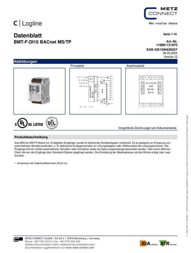110881131970 Metz Connect BMT-F-DI10 BACnet MS/TP 110881131970 24 V/AC, 24 V&#47...