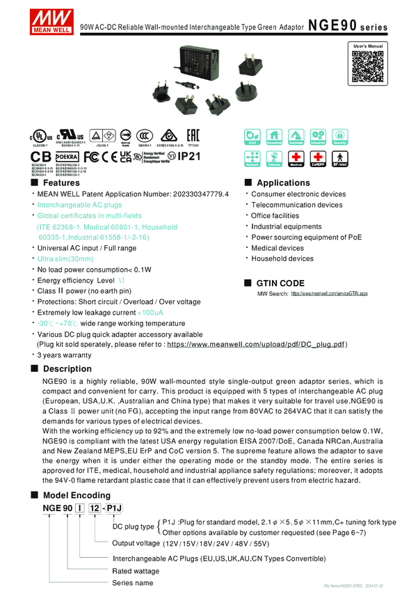 NGE90E15-P1J Zasilacz wtyczkowy, stałonapięciowy MW Mean Well NGE90E15-P1J 82.5 W
