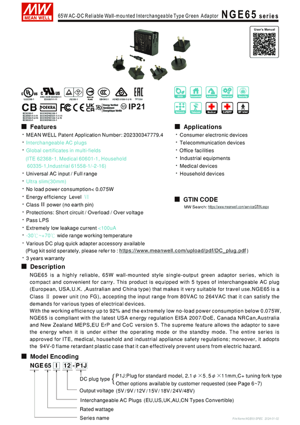 NGE65I24-P1J Zasilacz wtyczkowy, stałonapięciowy MW Mean Well NGE65I24-P1J 65 W