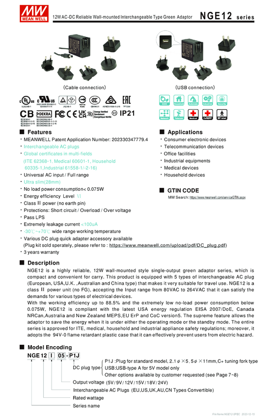 Zasilacz wtyczkowy, stałonapięciowy MW Mean Well NGE12E12-P1J 12 W