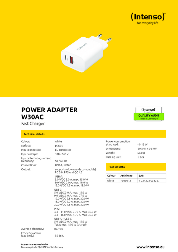 7803012 Intenso W30AC Ładowarka USB 30 W 1x USB-A, 1x USB-C® biały dom USB Power De...
