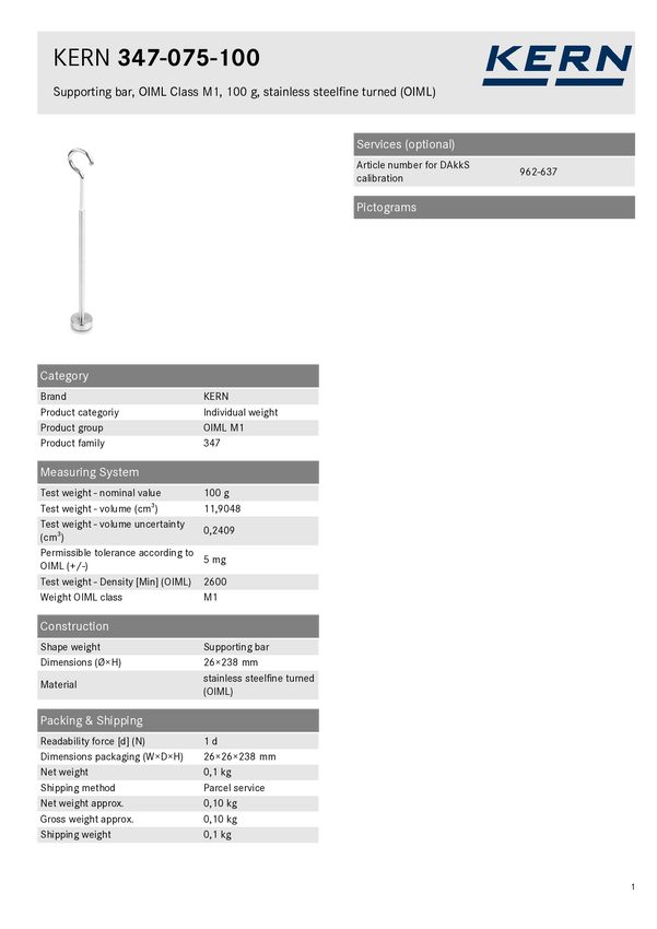 Pręt nośny 347-075-100, klasa OIML M1, wartość nominalna 100 g, drobno toczona stal nierdzewna (OIML) Kern 347-075-100 3